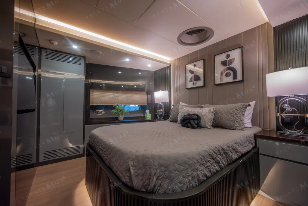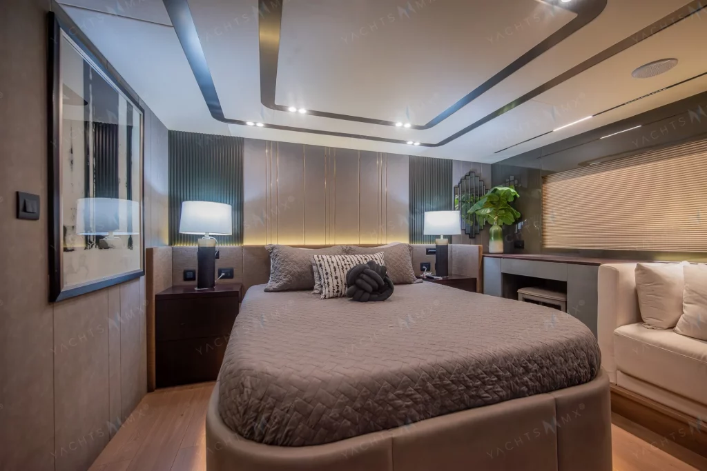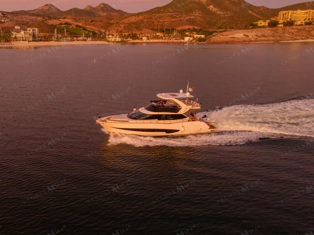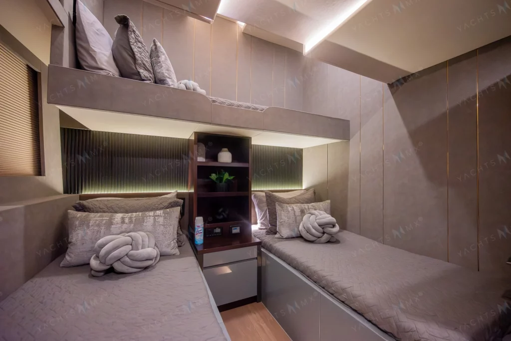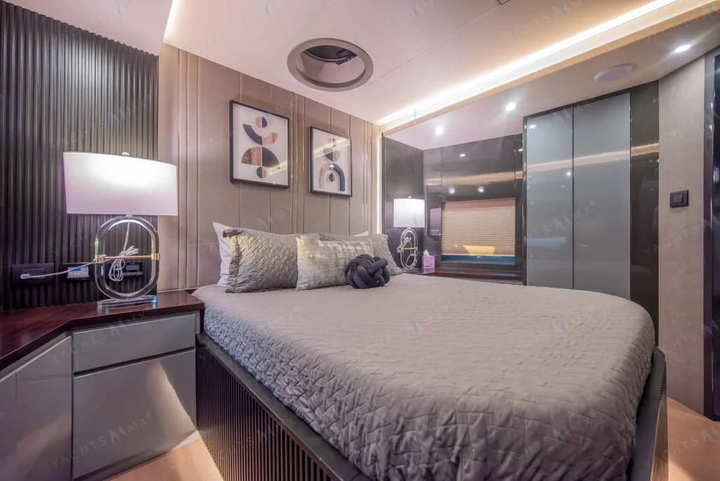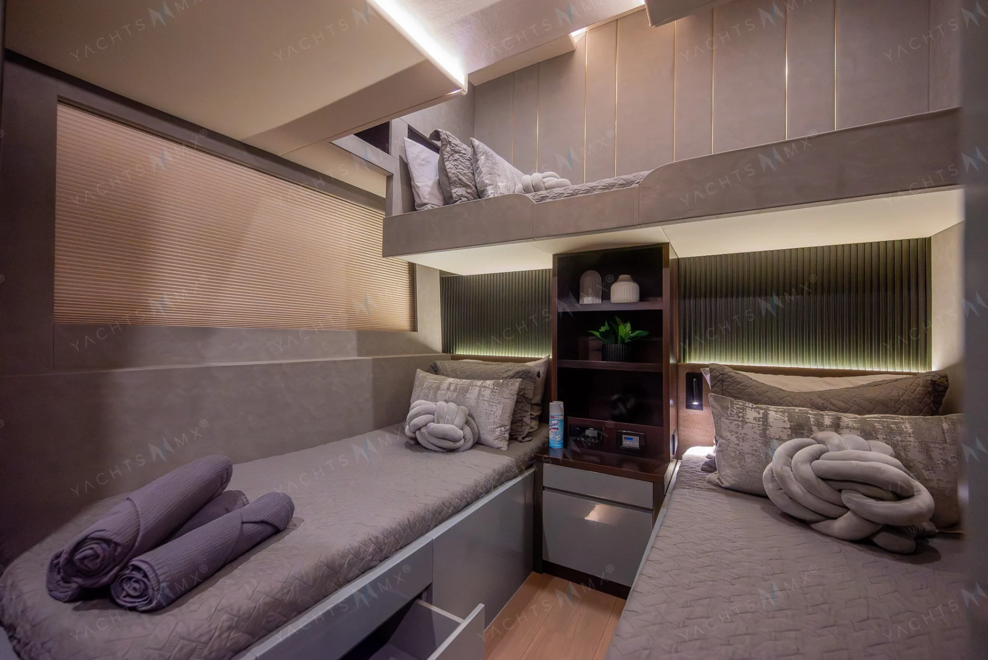 Con 4 cabinas y 4 baños, este yate ofrece un nivel de amplitud y confort que sorprende, incluyendo un flybridge de 12 ft, más amplio que el de muchos yates de 80’. Perfecto para 8 pasajeros, combina diseño moderno, acabados de lujo y un rendimiento excepcional para recorrer el Mar de Cortés.