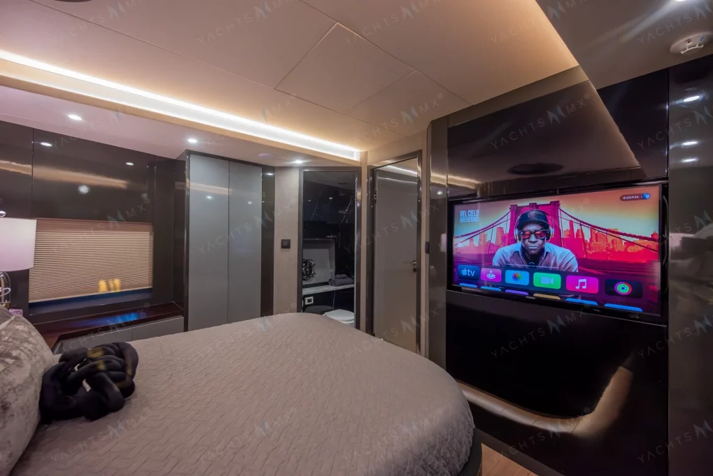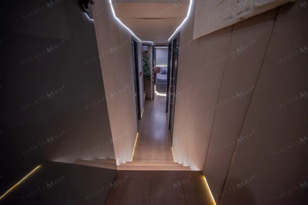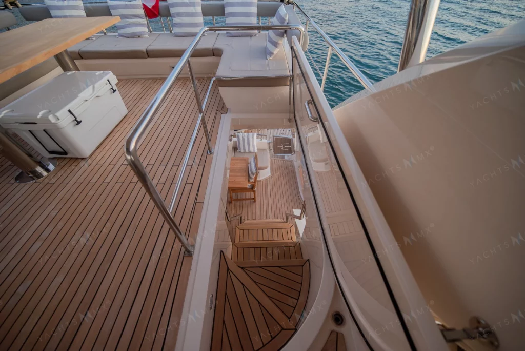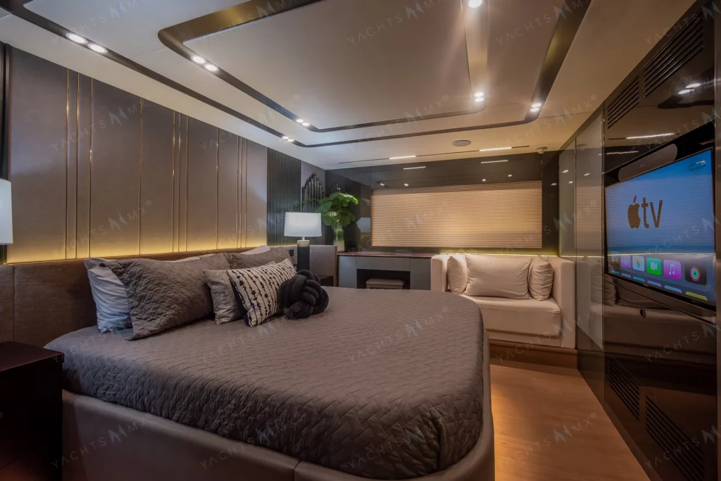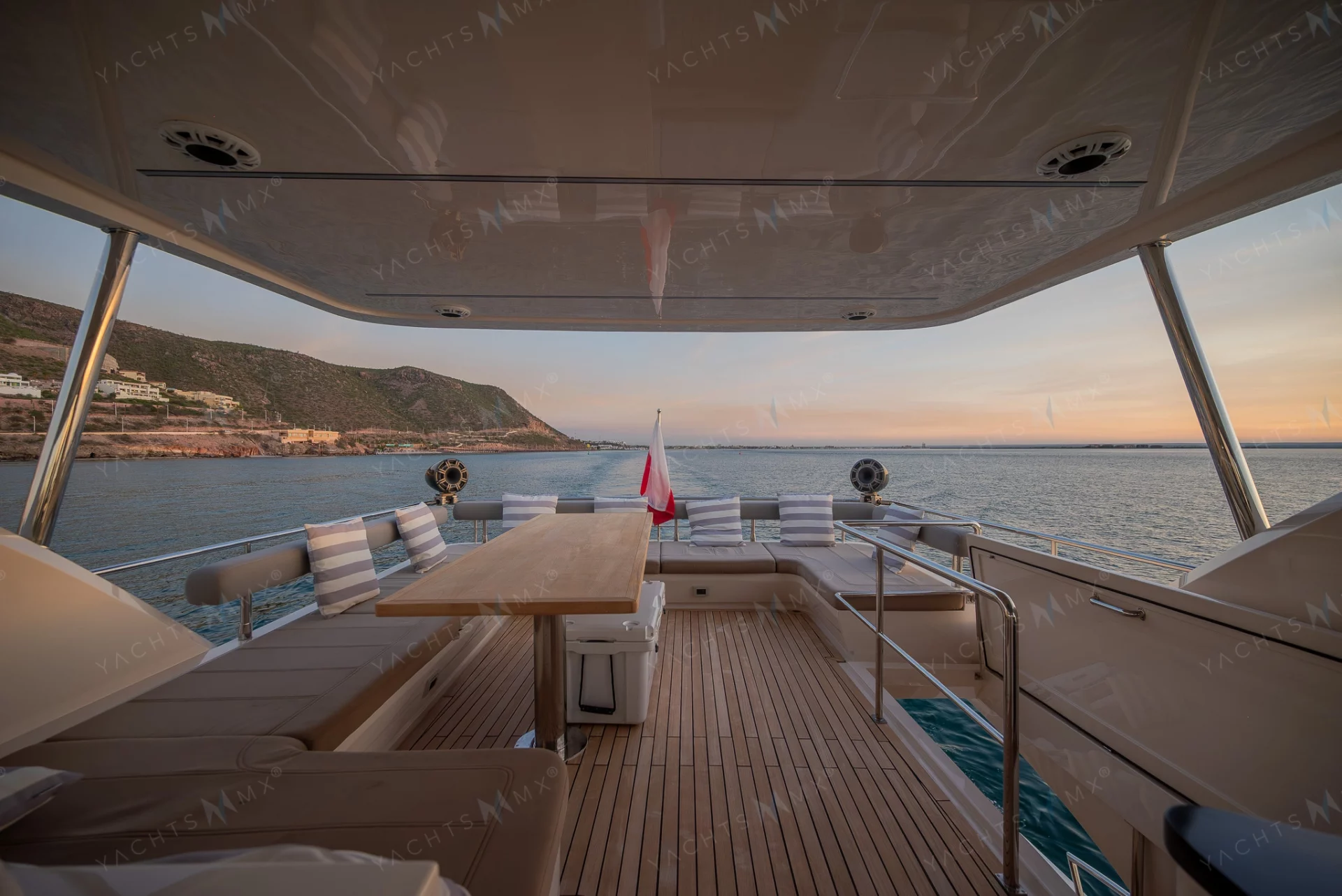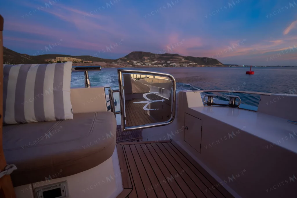 Con 4 cabinas y 4 baños, este yate ofrece un nivel de amplitud y confort que sorprende, incluyendo un flybridge de 12 ft, más amplio que el de muchos yates de 80’. Perfecto para 8 pasajeros, combina diseño moderno, acabados de lujo y un rendimiento excepcional para recorrer el Mar de Cortés.