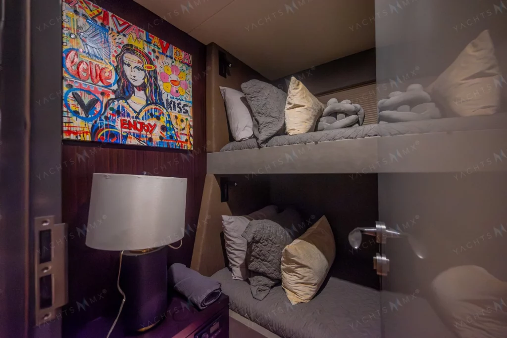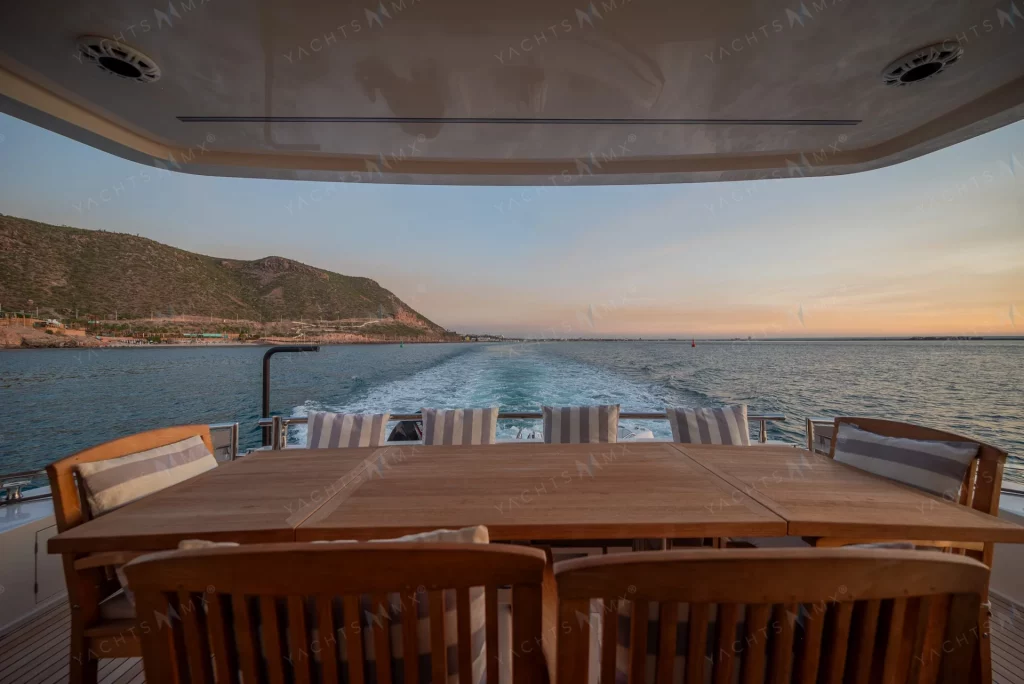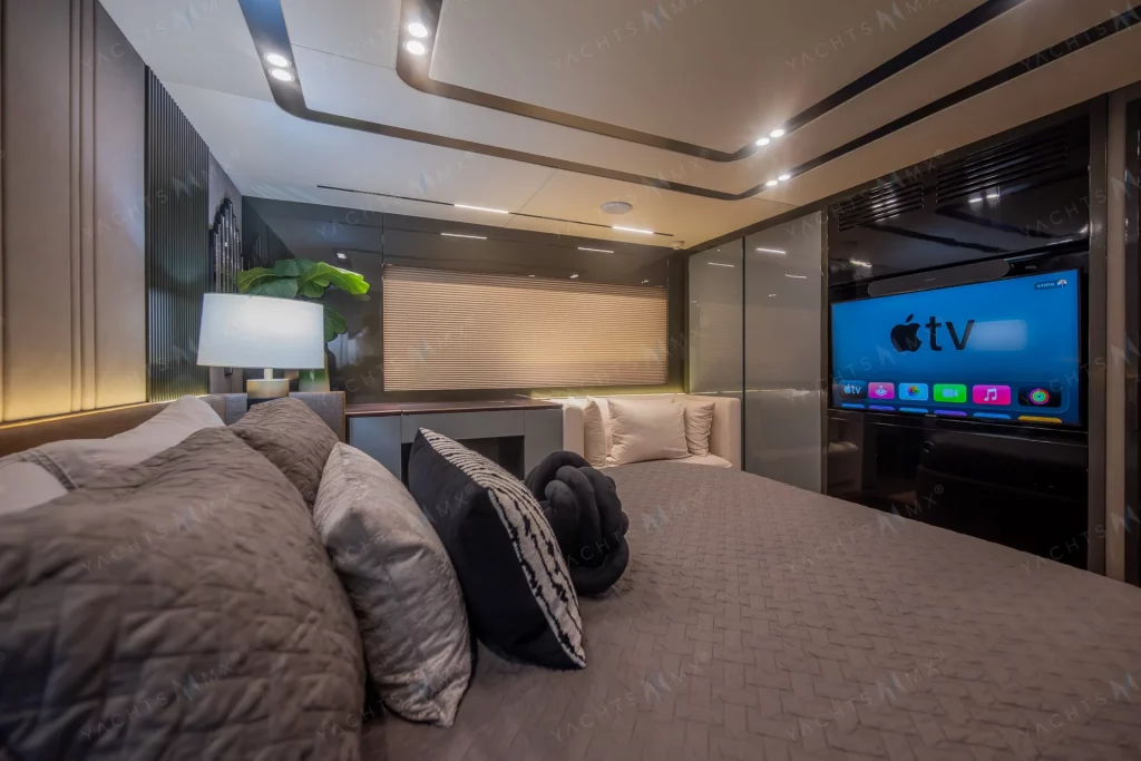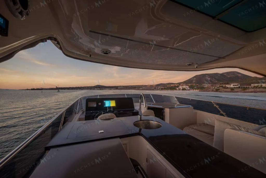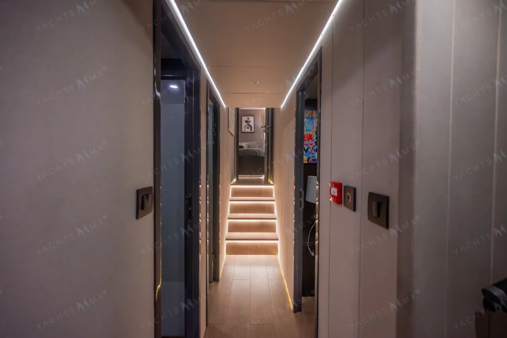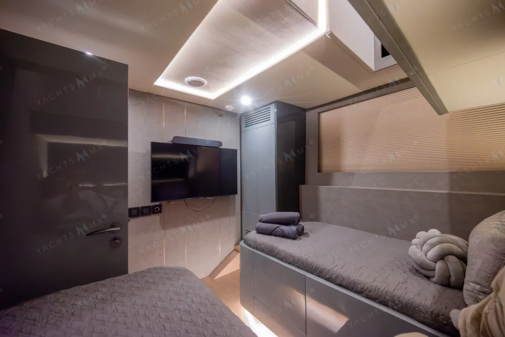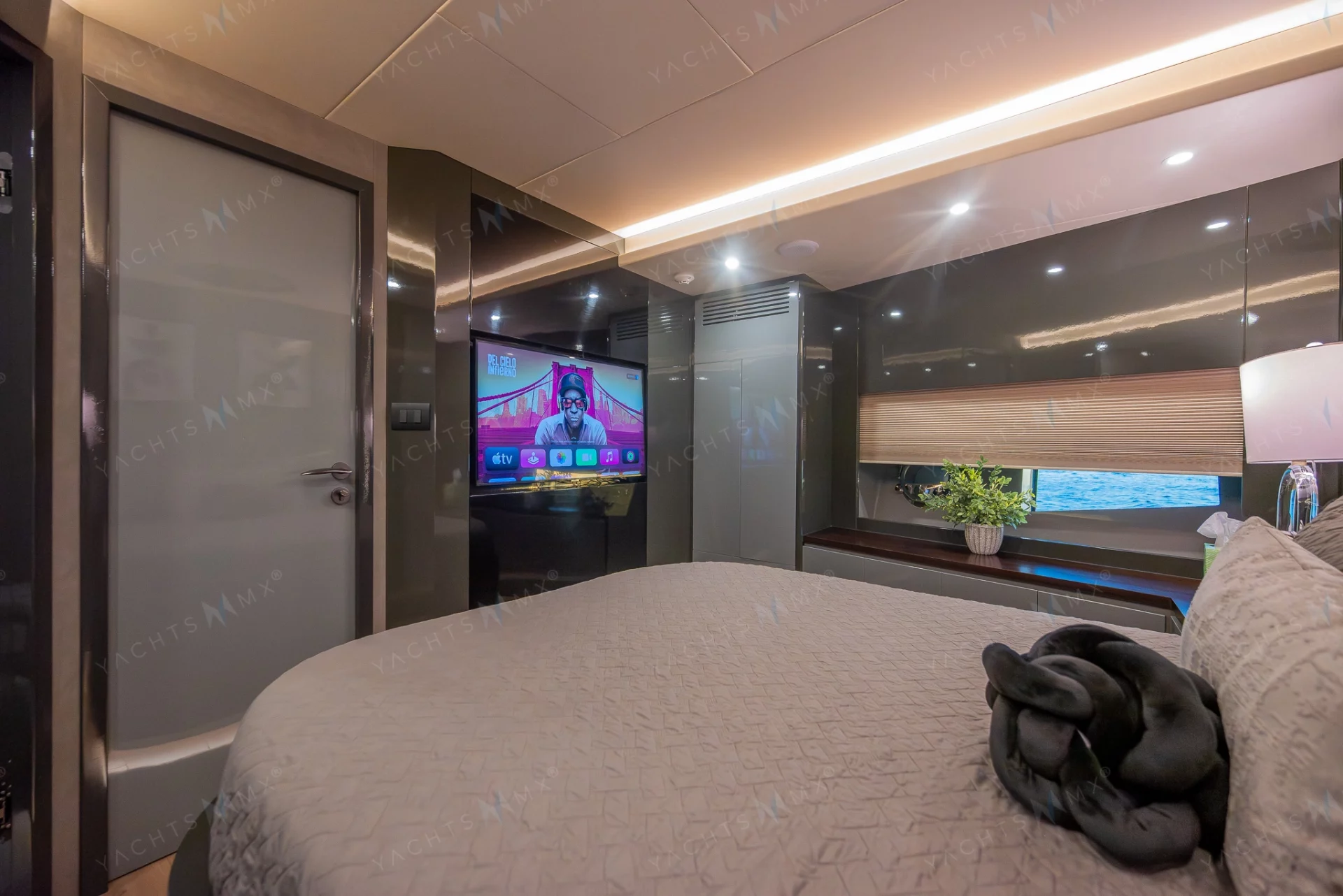 Con 4 cabinas y 4 baños, este yate ofrece un nivel de amplitud y confort que sorprende, incluyendo un flybridge de 12 ft, más amplio que el de muchos yates de 80’. Perfecto para 8 pasajeros, combina diseño moderno, acabados de lujo y un rendimiento excepcional para recorrer el Mar de Cortés.
