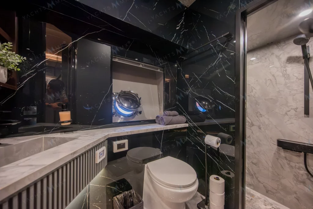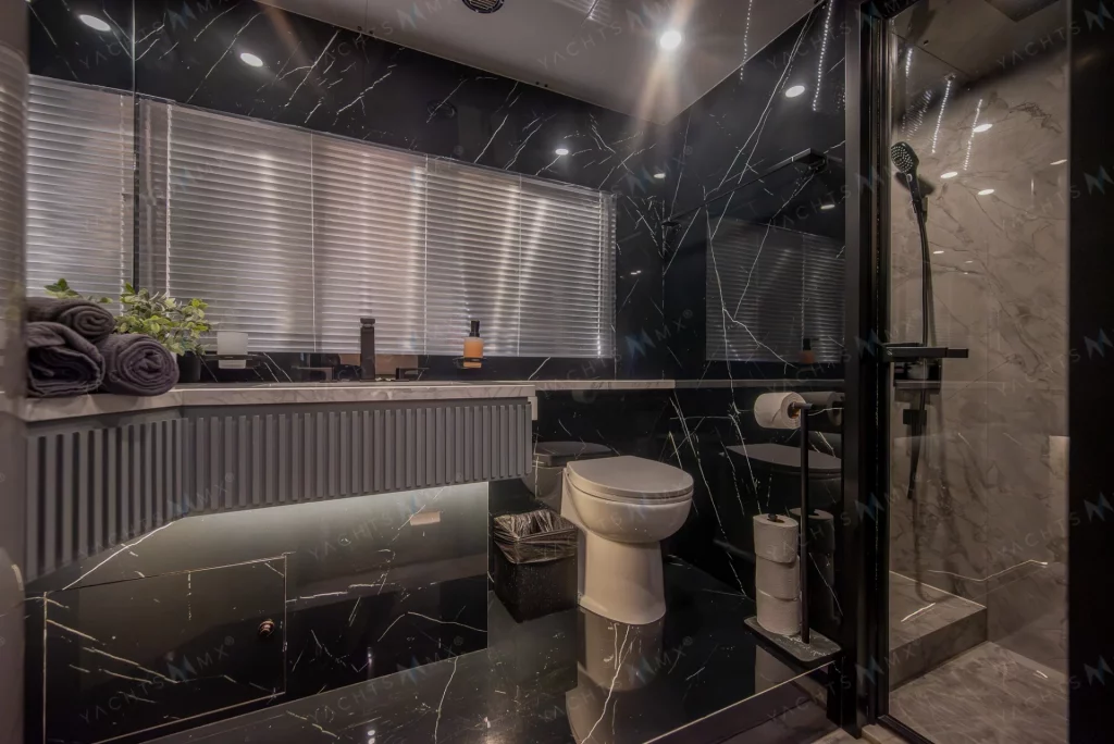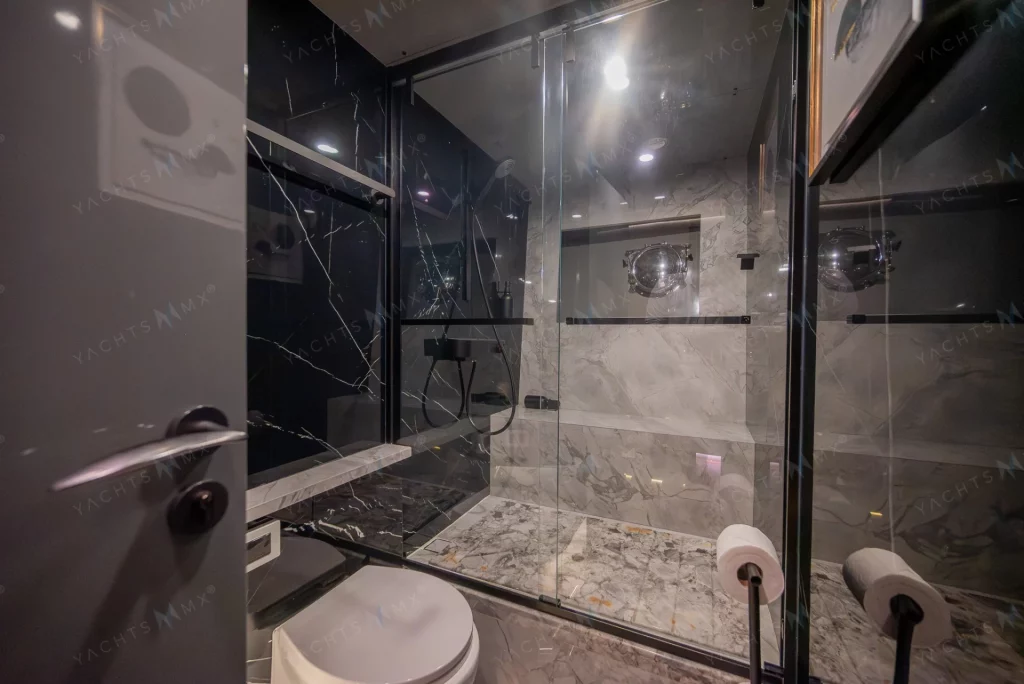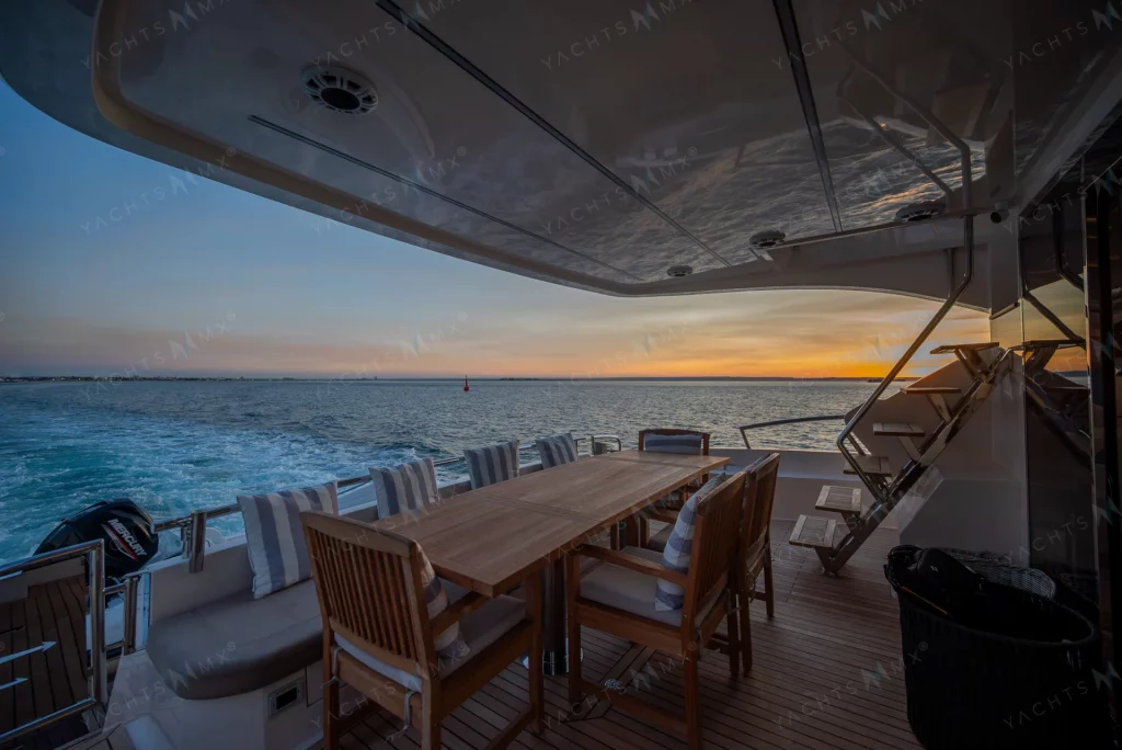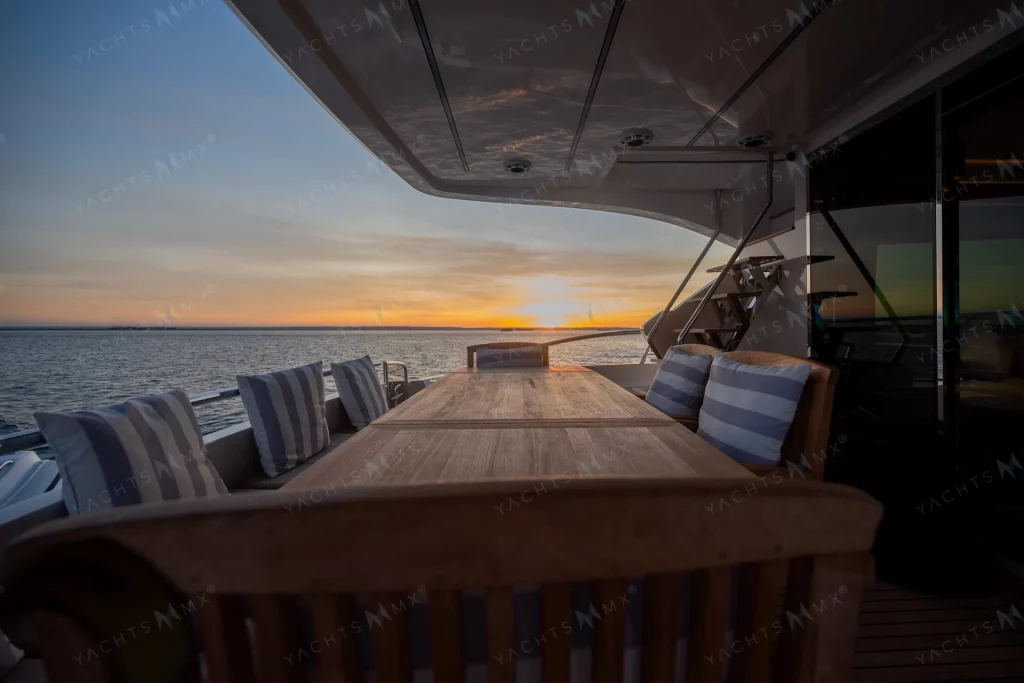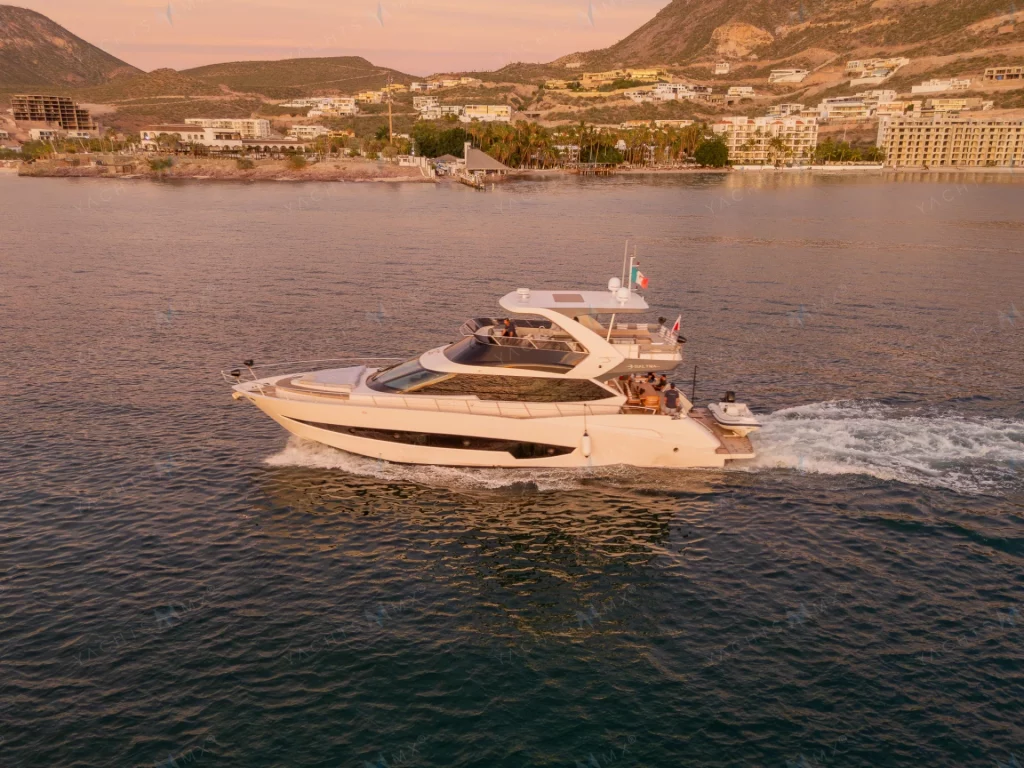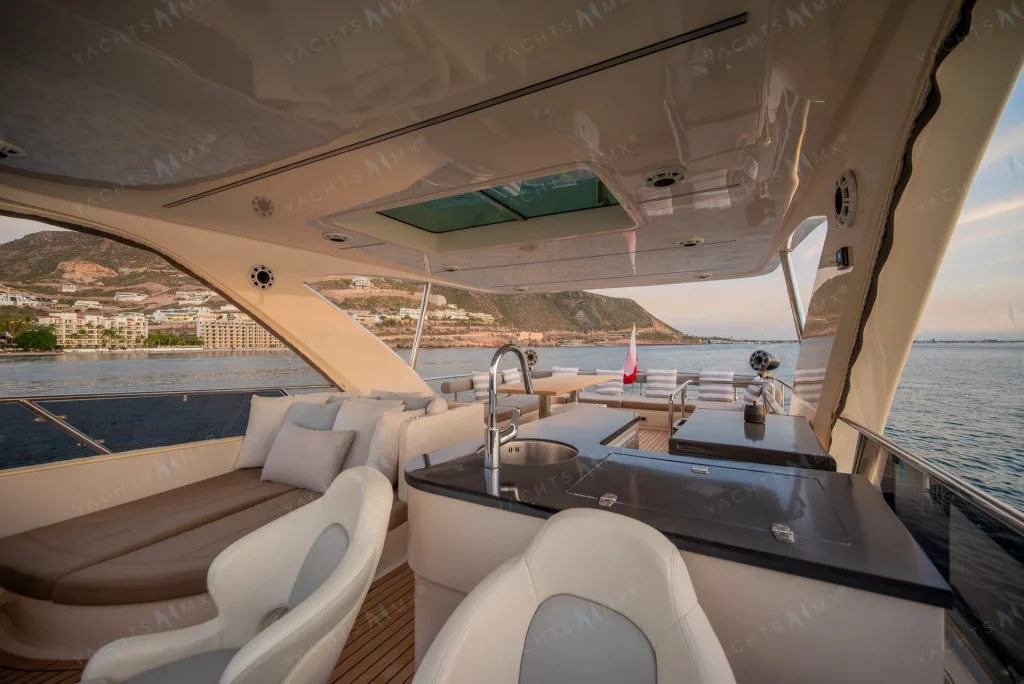 Con 4 cabinas y 4 baños, este yate ofrece un nivel de amplitud y confort que sorprende, incluyendo un flybridge de 12 ft, más amplio que el de muchos yates de 80’. Perfecto para 8 pasajeros, combina diseño moderno, acabados de lujo y un rendimiento excepcional para recorrer el Mar de Cortés.